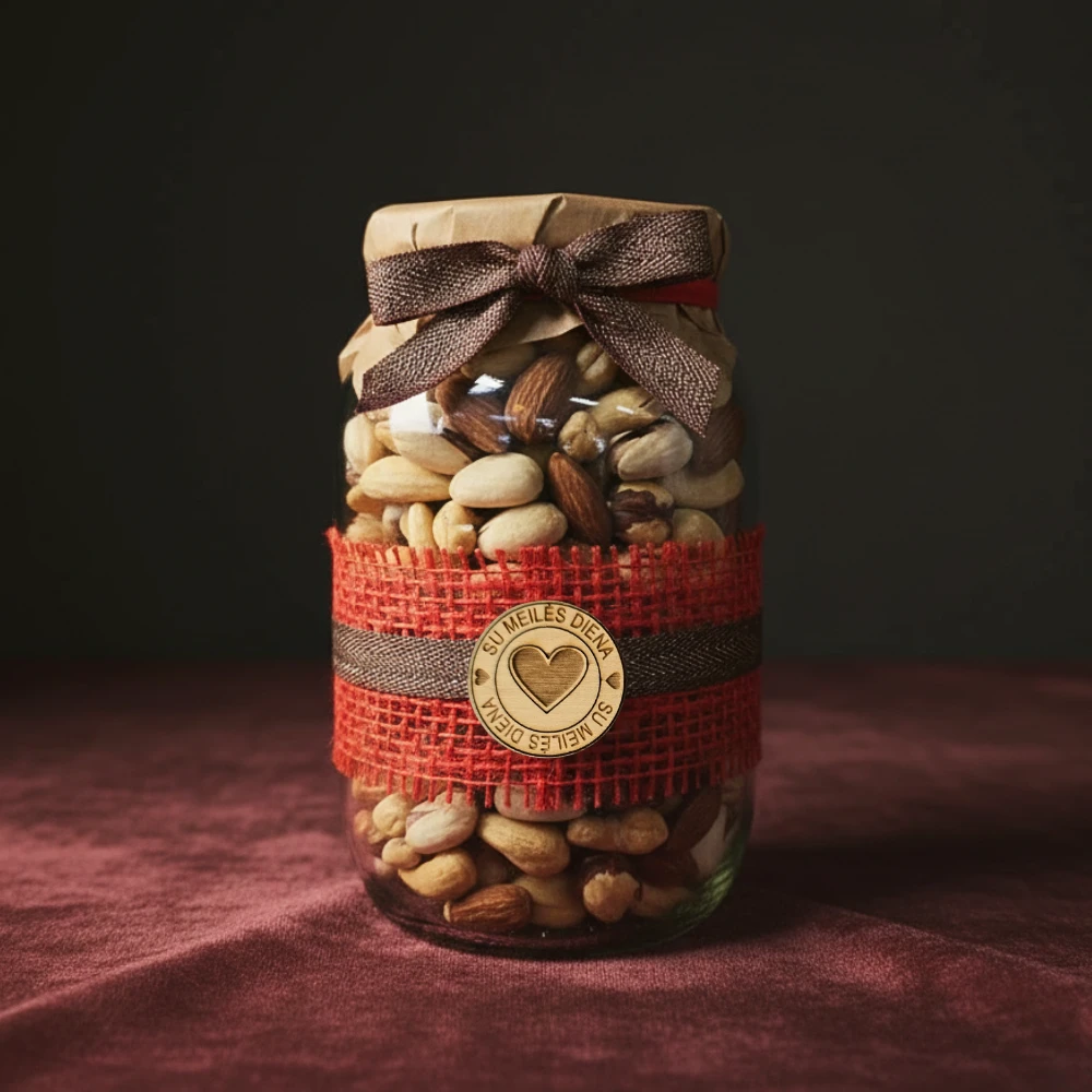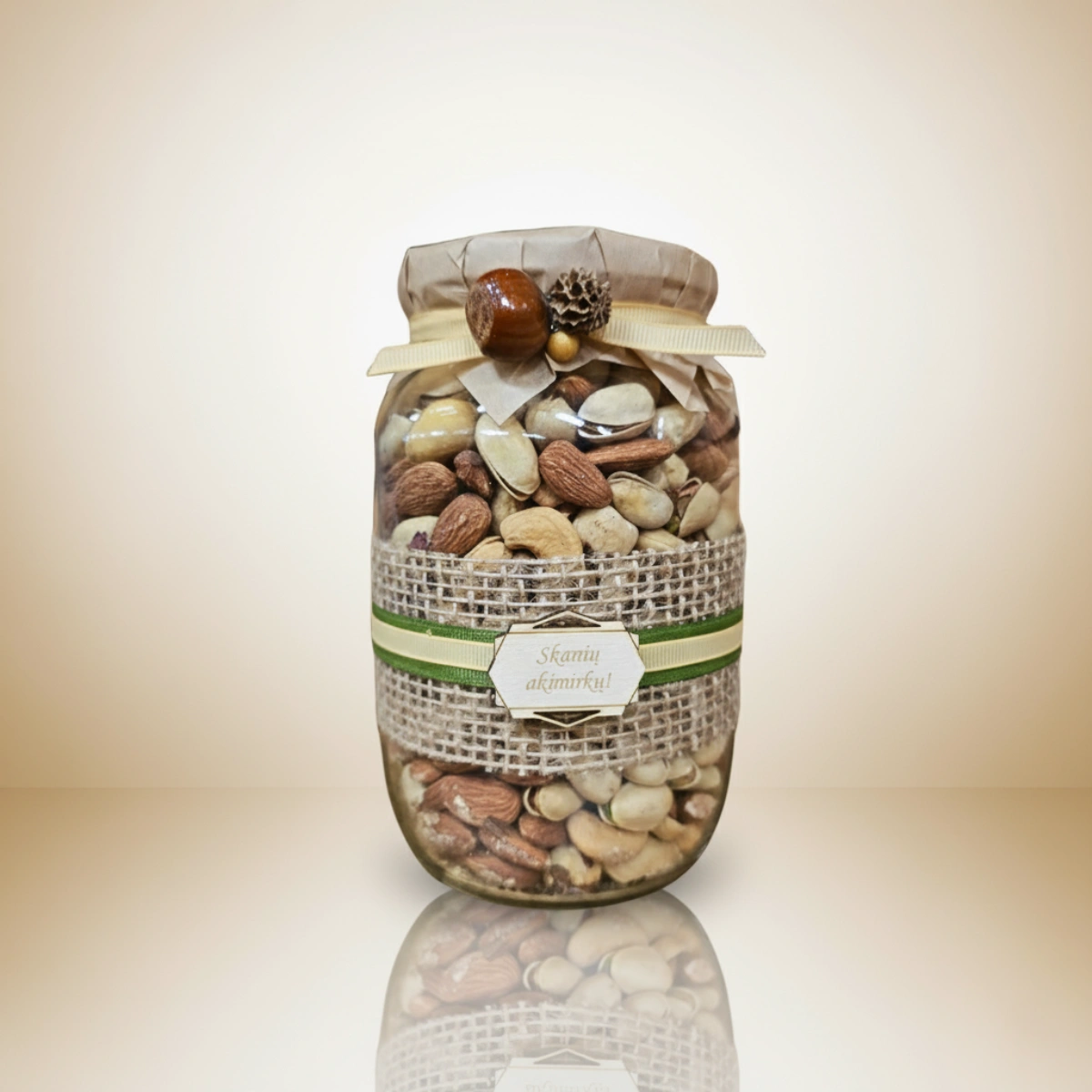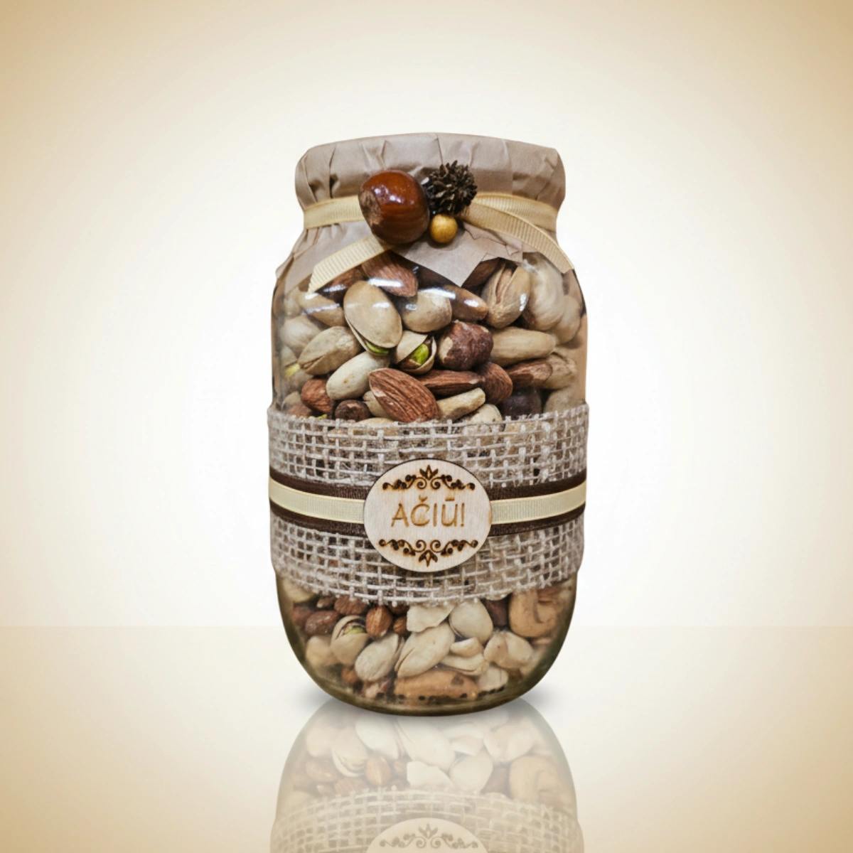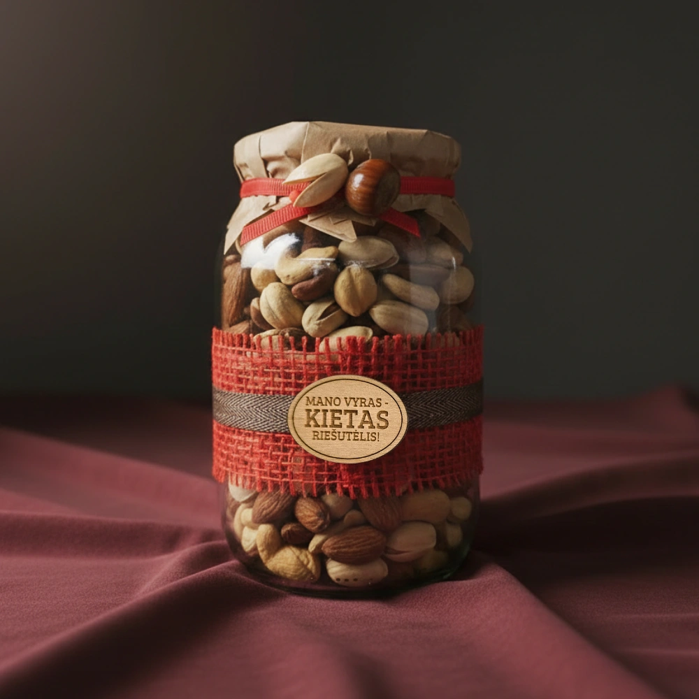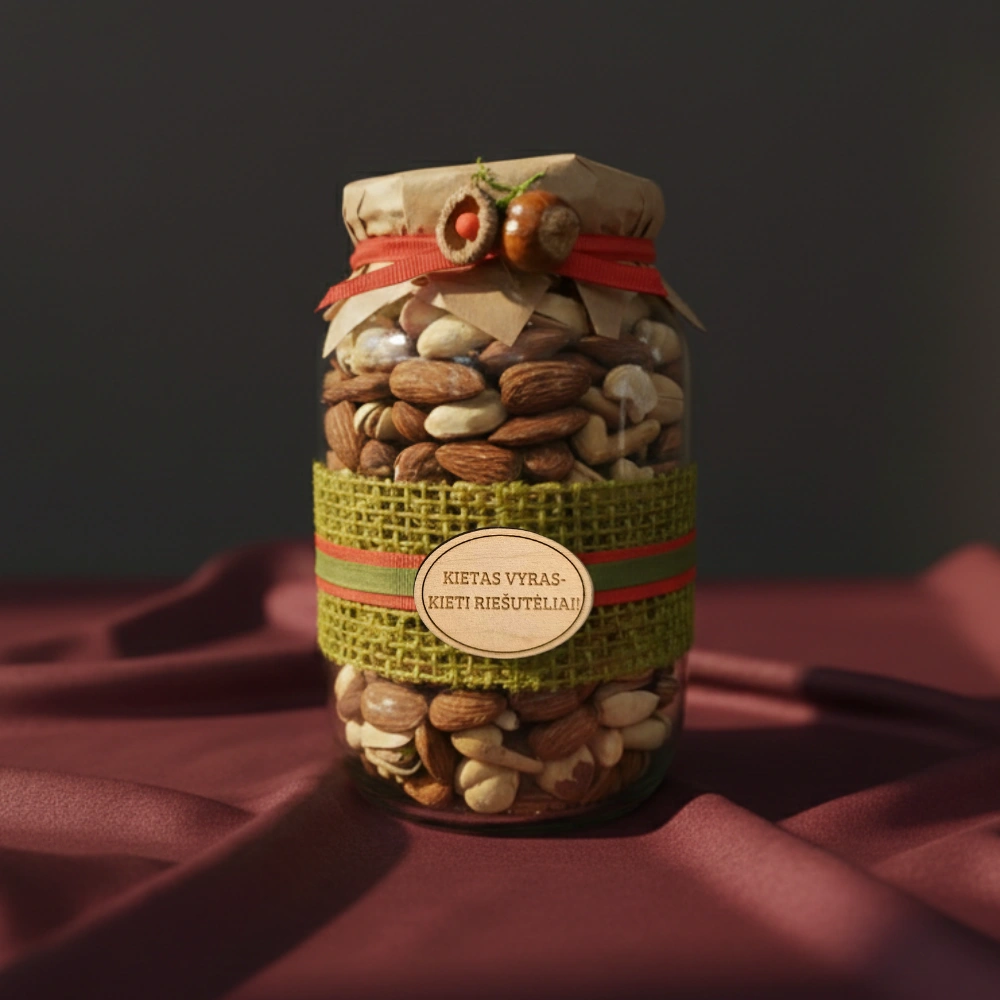 Stiklinis indas su metaliniu dangteliu, dekoruotas juostomis ar sveikinimo užrašais pagal progą. Juostelių spalvos ir smulkios dekoracijos gali skirtis, tačiau kiekvienas riešutinis stiklainis atrodo šventiškai ir estetiškai.