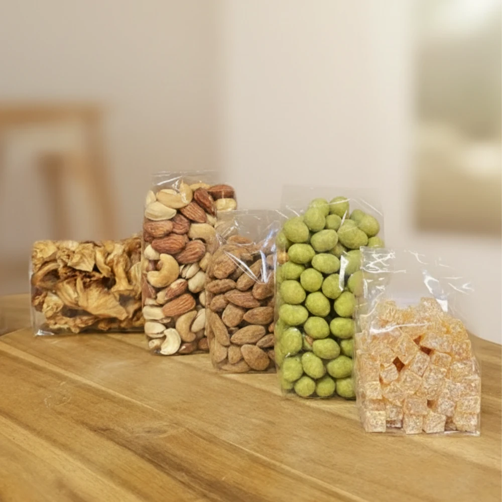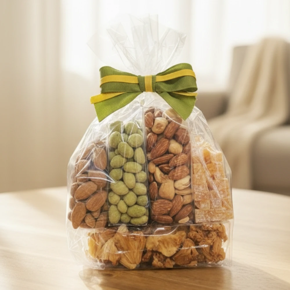 Keturi kruopščiai atrinkti produktai sudaro pilnavertį užkandžių pagrindą šeimos vakarams – sotūs riešutai, prieskoniuoti skoniai ir natūraliai saldūs vaisiai. Kad vakaras būtų dar šiltesnis, prie rinkinio pridedame apelsinų kubelius (100 g) kaip dovaną nuo mūsų – be pridėtinio cukraus, tinkamus visai šeimai.